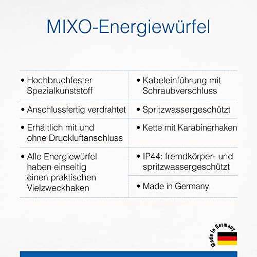 Applicazione: Il distributore di corrente MIXO è conforme alla classe di protezione IP44. ottimamente adatto per cantieri, aree commerciali ed esterni. Gestione intelligente dell'alimentazione anche per officine, sale hobby e scuole