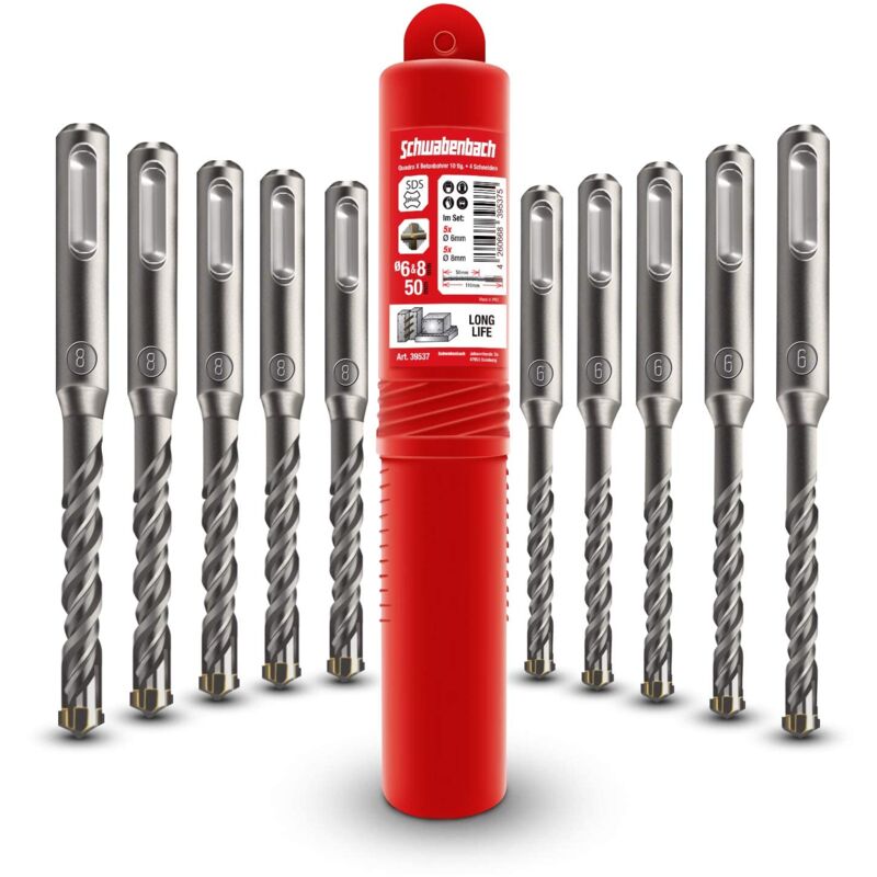 Punta per trapano SDS Plus, diametro 6 mm/8 mm, 110 mm, 10 pezzi. Set ideale per forare rapidamente il calcestruzzo. Punte in metallo duro di alta qualità. Non si incastrano nei ferri dell'armatura. Set da 10 pezzi. Descrizione: con le nostre robuste punte in acciaio temprato, i lavori su calcestruzzo, muratura, pietra o intonaco possono essere eseguiti senza problemi. Le punte possono essere utilizzate con tutte le macchine con attacchi SDS Plus. Vantaggi: punte professionali da trapano a percussione per la lavorazione di muratura, cemento e cemento armato Realizzate in metallo duro per una buona durata e resistenza. Doppia spirale per un'efficace rimozione della polvere di perforazione senza intasamento. Foratura più veloce del 25% grazie ai quattro taglienti / testa a croce (Quadro X), per una foratura ottimizzata in caso di armatura. Con questo trapano potrete trapassare quasi ogni parete. Dati tecnici Diametro: 5 x 6 mm, 5 x 8 mm. Lunghezza complessiva: 110 mm. Lunghezza di