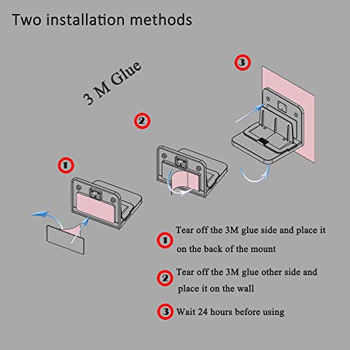 INSTALLAZIONE con ADESIVO - Con nastro biadesivo 3M (incluso) e può essere installato su quasi tutte le superfici verticali. Non sono necessarie viti, non danneggia il muro. Limite massimo di peso: 1 kg. Nota: Lasciare riposare l'adesivo 3M per 24 ore prima di utilizzare il supporto.