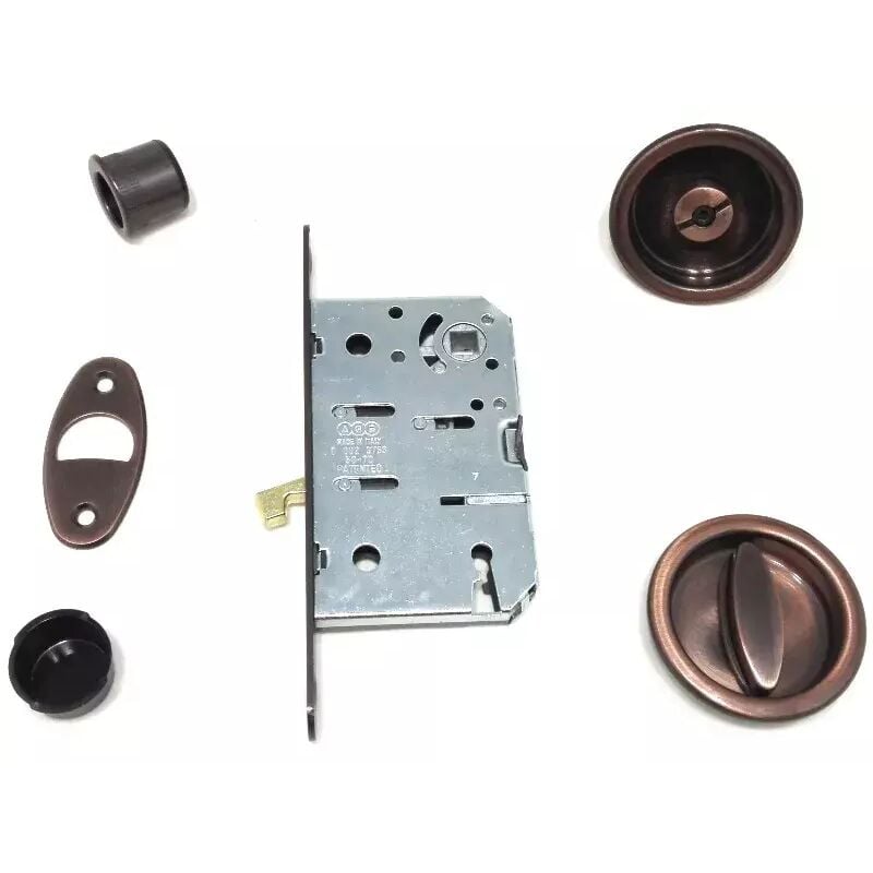Kit SCIVOLA A per porta scorrevole completo di serratura scivola T e 2 maniglia ad incasso diametro mm.48, versione libero occupato per spessore anta mm.40-48 mm. Finitura bronzato.