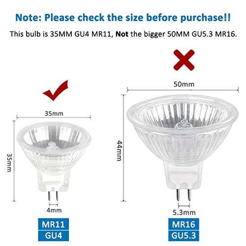 ✦【35 x 35 】4mm tra 2 pin, dimensioni della lampadina 35 x 35 mm, assicurati che la lampadina si adatti alla tua lampada prima dell'acquisto. Notare la differenza di dimensioni tra le lampadine MR11 GU4 e MR16 GU5.3.
