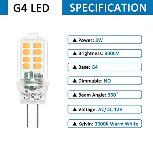 ✦ 【Alta Qualità】 G4 LED 3W sostituisce la lampadina alogena G4 25w, risparmiando il 88% di consumo energetico. Le lampadine a LED G4 hanno una durata fino a 30.000 ore, più durevoli, risparmiano sui costi di sostituzione delle lampadine.