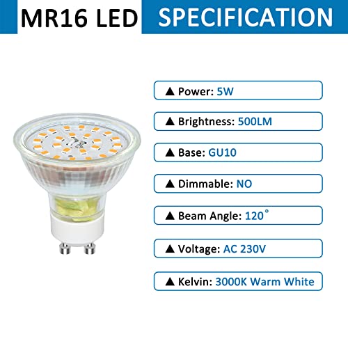 SCNNC Lampadina LED GU10 MR16 230 V 5 W bianco caldo 3000 K 500 lm, non dimmerabile, equivalente faretto alogeno 50 W, 50 mm, lampadina LED riflettore GU10 per plafoniera, illuminazione armadio, 6