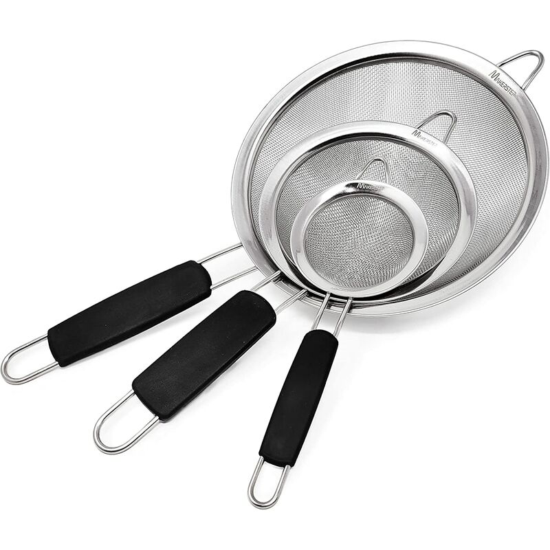Set di 3 schermi a maglia fine nelle dimensioni: 3 3/8", 5 1/2" e 7 7/8" Filo di acciaio inossidabile di alta qualità che non arrugginisce né si corrode. Facile da pulire. Lavabile in lavastoviglie e può essere utilizzato per scolare la pasta o le verdure calde Maneggiare i liquidi bollenti Utilizzare Anello per appenderlo integrato nella parte superiore di ogni colino Appenderli per un facile accesso e liberare spazio negli armadi e nei cassetti della cucina i colini sono sempre lì, dove servono. > Ideale per setacciare farina, zucchero, caffè e altri cibi secchi Adatto anche come setaccio per la cottura Consente di rimuovere le impurità per un uso più sicuro e un miglior sapore.