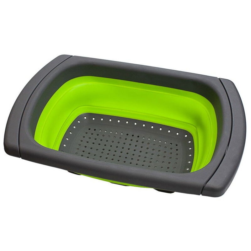 Questo grande scolapasta rettangolare può essere piegato per riporlo facilmente. Una volta piegato, lo scolapasta non occupa molto più spazio di un piatto, ad esempio, e può essere impilato sopra altri utensili da cucina. Quando è esteso, lo scolapasta è di ca. Alta 12 cm e funziona anche come bacinella, oppure da posizionare direttamente nel lavello, in quanto può poggiare saldamente su un piano. Lo scolapasta è lungo 39 cm, ma con i manici estensibili di 13,5 cm per lato diventa abbastanza largo da coprire quasi tutte le stoviglie, il che rende più facile sciacquare verdure e pasta secca. Lo scolapasta è realizzato in plastica priva di BPA ed è lavabile in lavastoviglie. - Grande scolapasta rettangolare - Può essere piegato per una facile conservazione - Manici allungabili Specifiche: Colore: verde, grigio Materiale: plastica, gomma Dimensioni, piegato: 39 x 26,5 x 4 cm Dimensioni, esteso: 66 x 26,5 x 12 cm La confezione contiene: 1x scolapasta