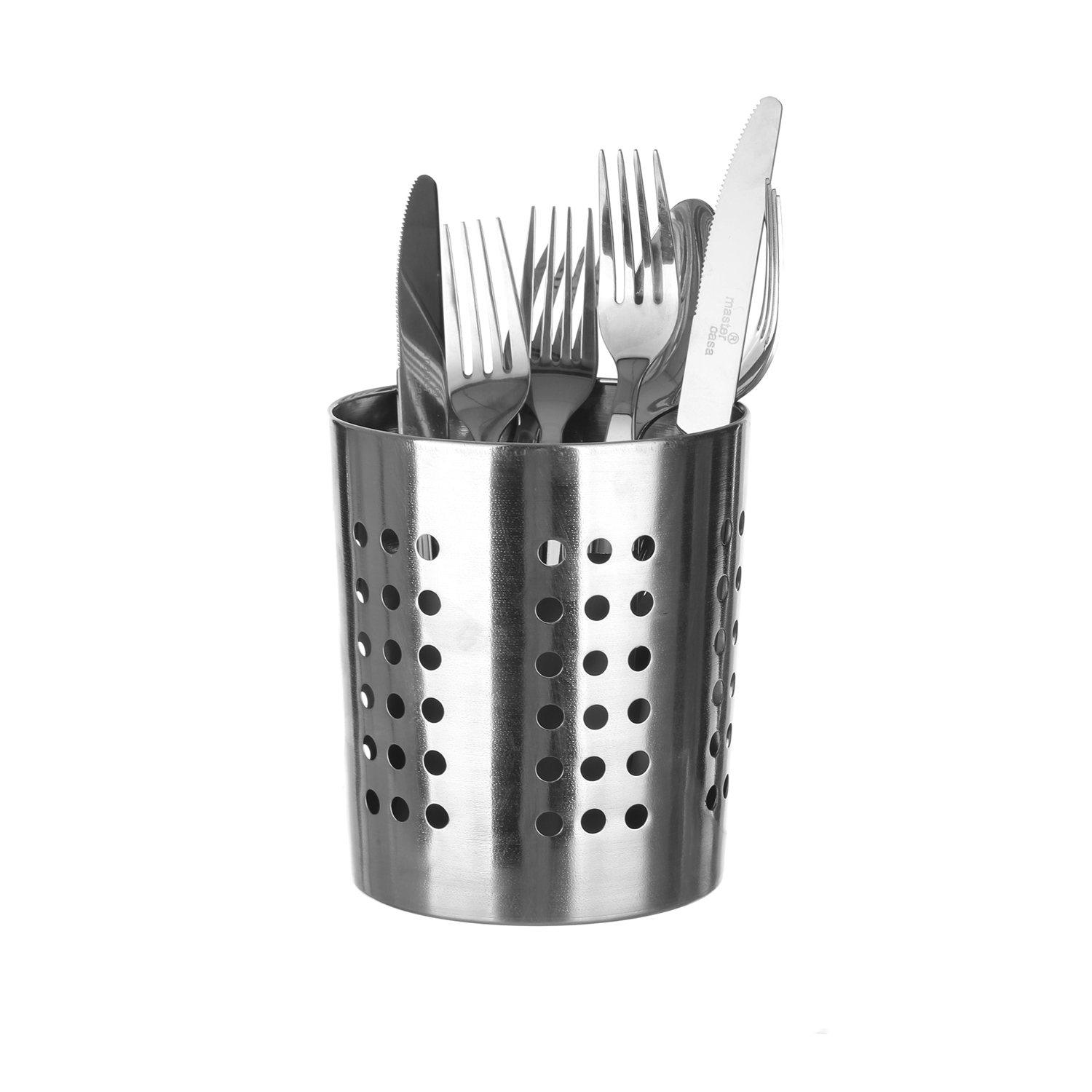 Lo scolaposate della linea Ideale di IPAC è un pratico accessorio da cucina dalla forma circolare e realizzato interamente in acciaio inox. Grazie alla struttura con fori laterali, permette di far scivolar via l'acqua dalle posate e da piccoli utensili appena lavati a mano, senza il bisogno di doverli asciugare per riutilizzarli nuovamente o per riporli nel cassetto. Utile e pratico da pulire, può essere lavato in lavastoviglie. Diametro 12 cm, altezza 14 cm.