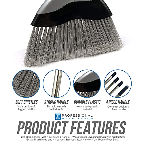 Scopa morbida per interni con manico lungo 120 cm - Spazzola per scopa a onda con setole morbide angolate e manico in acciaio inox a 4 sezioni, spazzola per pavimenti in casa e cucina