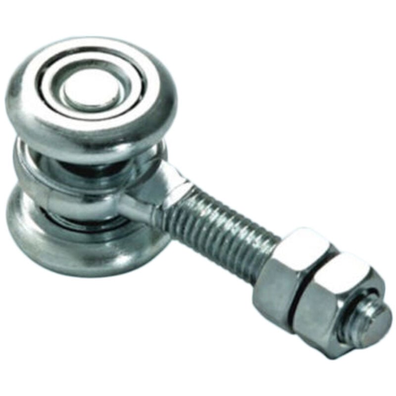 SCORREVOLE PER PORTE Scorrevole comunello in acciaio forgiato zincato con cuscinetti torniti e cementati.2 ruote d. 24 mm.Filetto 12 MA.Completo di 2 dadi.