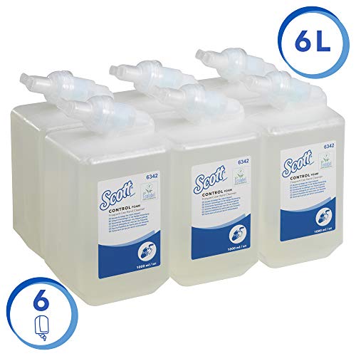 Scott Control 6342 Sapone per mani in schiuma per uso frequente, Sapone per mani in schiuma inodore, 6 ricariche di Sapone per mani trasparente da 1 litro, Totale 6 litri
