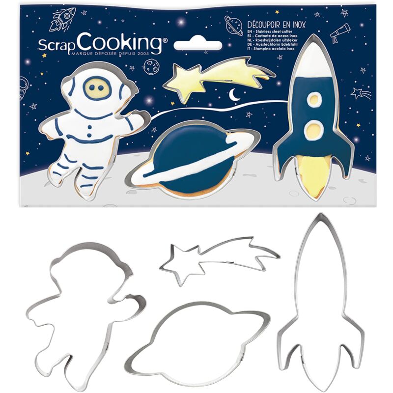 Materiale: acciaio inox adatto al contatto con gli alimenti. Dimensioni astronauta: 7,3 x 9,1 x 2,5 cm. Dimensioni razzo: 5,3 x 11 x 2,5 cm. Dimensioni stella cadente: 7,7 x 2,3 x 2,5 cm. Dimensioni pianeta: 8,7 x 5,1 x 2,5 cm