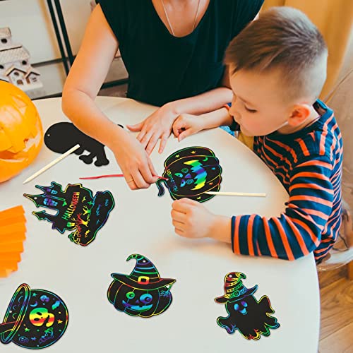 51 Pz Scratch Art Halloween Carta Gratta e Vinci Arcobaleno Disegnare Scarabocchiare Zucca Fantasma Pipistrello Stilo Bambù Nastro Colorato Decorazioni Halloween Regalo Bambini Adulti Fai da Te