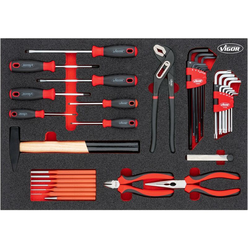 2-component soft foam insert Insert measurement / drawer size: L (563 x 393 x 35 mm) VIGOR 2-Alloggiamenti in espanso morbido per componenti Facile da pulire: sciacquare sotto acqua corrente e asciugare Rapida individuazione degli utensili mancati grazie al vano rosso Tutto al proprio posto per un perfetto ordine Protegge gli utensili grazie ad un posizionamento antiscivolo Ogni utensile ha il suo posto predefinito Resistente a oli e grassi Dimensioni / Lunghezza: 563 mm x 393 mm x 35 mm Insert measurement / drawer size: L (563 x 393 mm) Altezza 35 Larghezza 393 Lunghezza (cavo) 563 Dimensioni dell'imballaggio 1 Contenuto della fornitura V1135, V6500-160, V1214, V1215, V1216, V1217, V1218, V1219, V1220, V1714, V1637, V1426N, V6502-200, V4708, V4942
