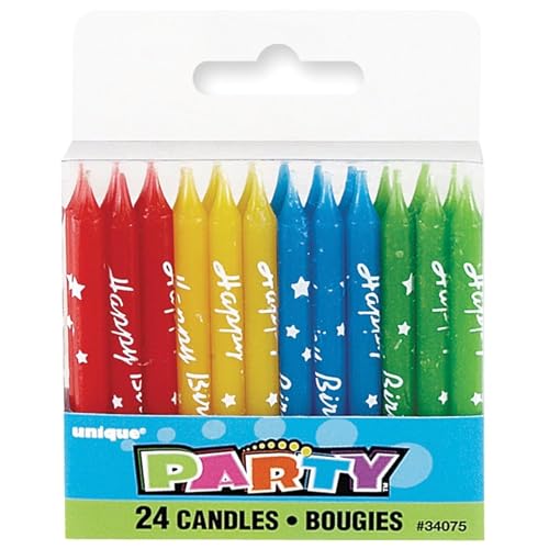 Confezione da 24 candeline con scritta Happy Birthday.