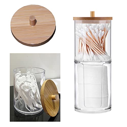 Sctmda Porta Cotton Fioc 2 Pezzi Contenitore Cotton Fioc Cotton Fioc Acrilico Porta Dischetti Cotone Contenitore e Dispenser Contenitori con Coperchio in Bambù per Dischetti di Cotone Trasparente