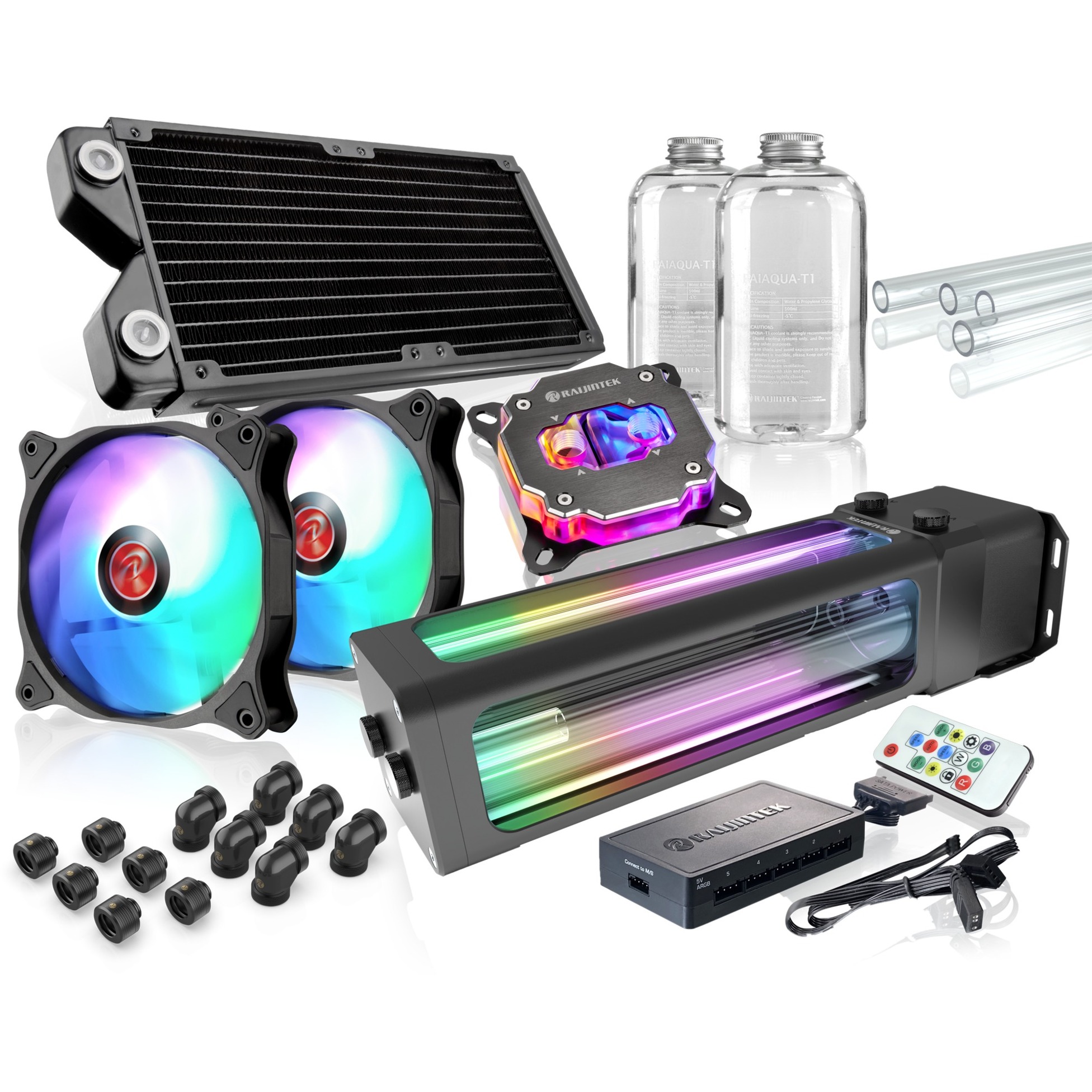 Il Raijintek SCYLLA PRO CA240 240mm è un kit completo di raffreddamento ad acqua hardtube. Una soluzione di raffreddamento ad acqua fai-da-te di prima classe in qualità premium. Un blocco acqua CPU FORKIS PRO RBW completamente in rame, una potente combinazione pompa/serbatoio ANTILA D5 EVO RBW ADD, un radiatore full copper da 240 mm, 2 bottiglie 500ml RAIAQUA-T1 Pure Clear Premium Coolant, ventola EOS 12 ADD PWM ad alta pressione statica, 12 raccordi in rame pieno 90°*6 & 180°*6,4*500mm tubi rigidi PETG e un HUB DI CONTROLLO indirizzabile (Rainbow) a 5 porte da 5 V con PWM a 5 porte e telecomando, un cavo connettore M/B per la sincronizzazione con M/B o tramite telecomando. Raijintek offre a tutti gli appassionati la migliore esperienza con il sistema di raffreddamento ad acqua fai-da-te.