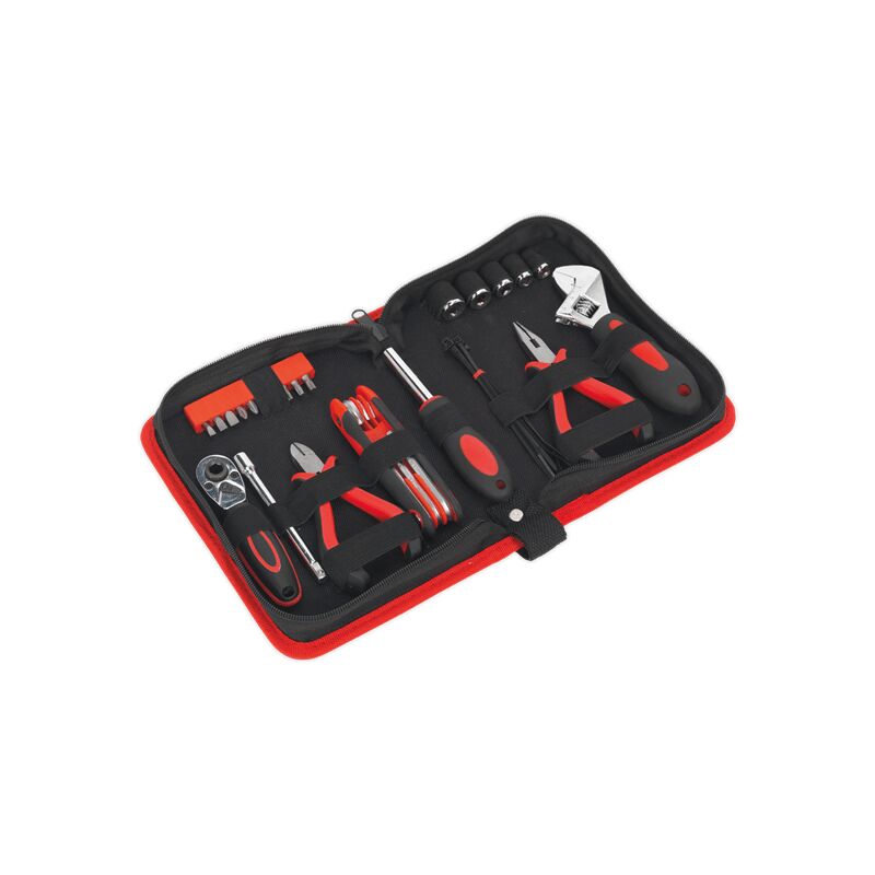 Kit di attrezzi compatto per moto da 28 pezzi, piccolo e compatto, che comprende una selezione di strumenti essenziali per la manutenzione della moto. Gli strumenti sono dotati di impugnature morbide. Fornito in una piccola custodia, ideale per essere riposto sotto il sedile della moto. Contenuto: Inserto lama piatta - 3, 4, 6 mm;