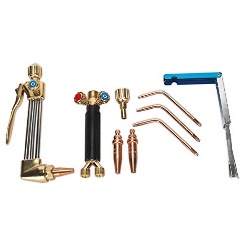 Comprende torcia da taglio, torcia per saldatura, ugello miscelatore, ugelli di saldatura leggeri n. 2, 5 e 10, ugelli da taglio ANMS da 1/16", 3/64" e 1/32".