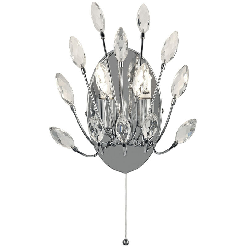 Collezione Pavone SPLENDITO CENTROTAVOLA La lampada da parete Peacock donerà eleganza e brillantezza a qualsiasi casa. Le bellissime forme in vetro cristallo sono fissate a una struttura cromata e una base che rifrange la luce per farla brillare intorno alle pareti. Questa applique starebbe benissimo contro gli interni scuri.