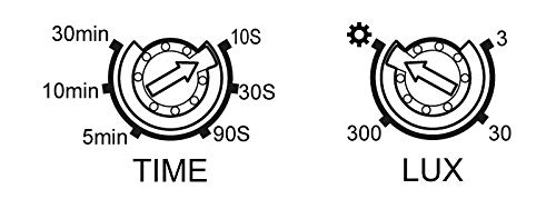 La durata di accensione va da 10 secondi fino a 30 minuti o permanentemente acceso o spento. Il sensore di movimento può essere regolato anche in base alla luminosità dell'ambiente (in un intervallo tra 3 e 2.000 LUX).