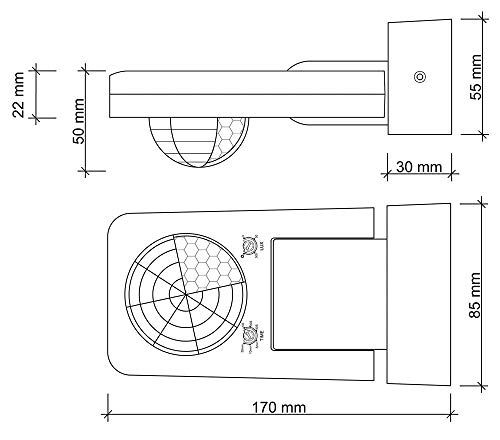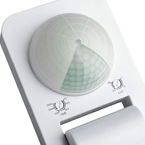 L'area di rilevamento di questo sensore ad infrarossi è di 20m e 360°, in cui la portata può essere ridotta attraverso una copertura modificata. Il sensore di movimento è orientabile verticalmente di 180°.