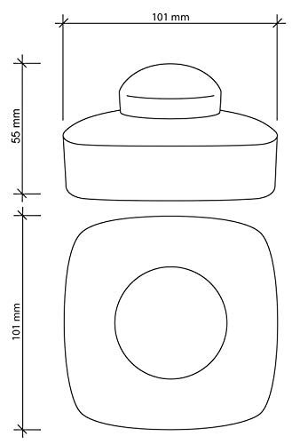 Sensore di movimento adatto agli ambienti esterni, grado di protezione IP65 e per montaggio a superficie a soffitto, dimensioni 101x55mm.