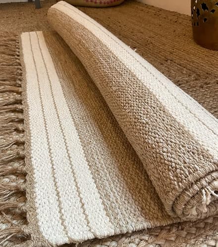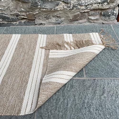 Second Nature Online Tappeto piccolo in cotone naturale e iuta, con triple strisce, beige e bianco, 60 x 90 cm