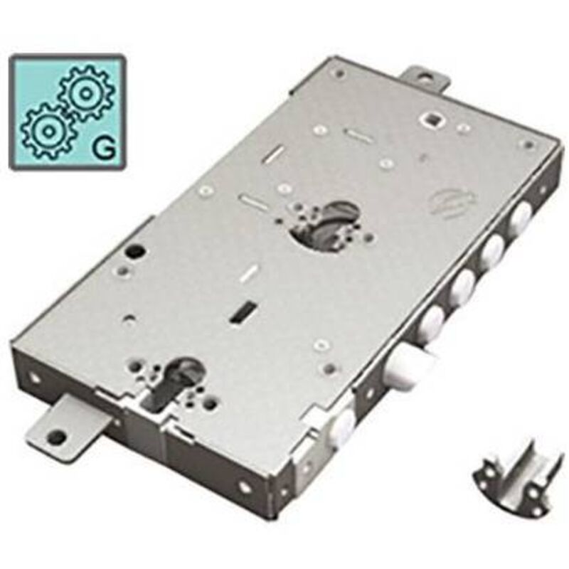 Per doppio cilindro sagomato indipendente. Scrocco reversibile azionabile da chiave o maniglia. La parte superiore aziona la chiusura triplice con catenaccio a 4 pistoni e 2 mandate, sporgenza Mm. 3 e corsa Mm. 29, e predisposizione per fissaggio aste, corsa Mm. 15. La parte inferiore aziona 1 catenaccio a 1 pistone e 2 mandate, corsa Mm. 20. Quadro maniglia Mm. 8, interasse Mm. 85. Scatola Mm. 136x254. In acciaio zincato. Compatibile 85595/28 Mottura.