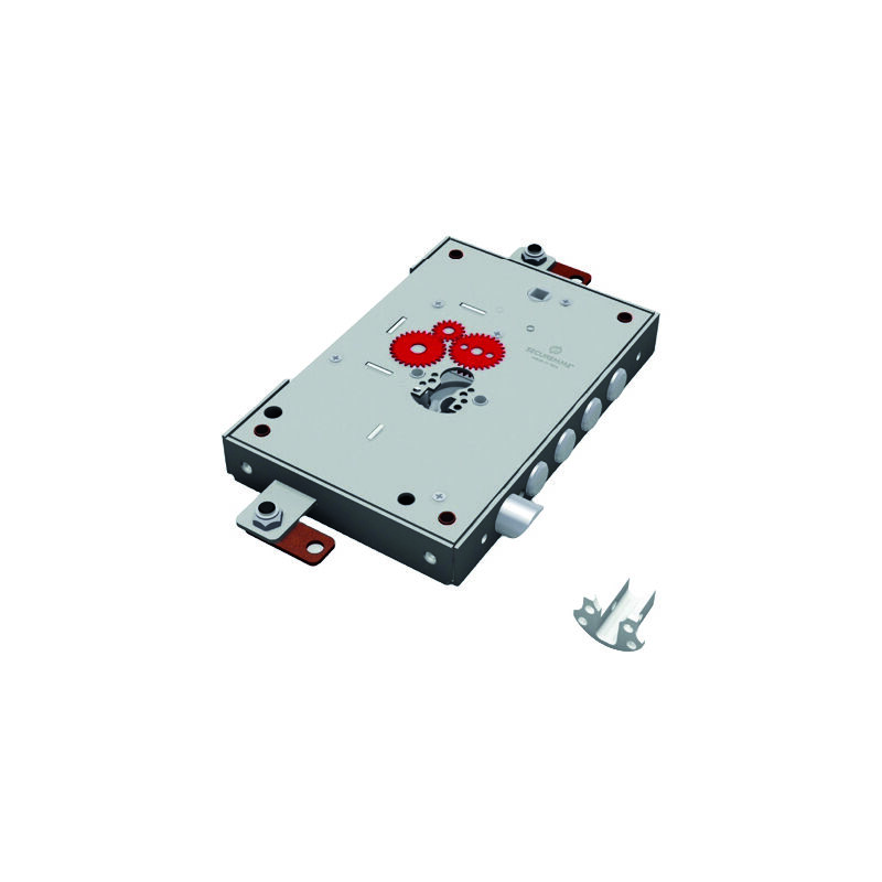 Serratura ad ingranaggi a cilindro. Chiusura triplice e scrocco, reversibile.