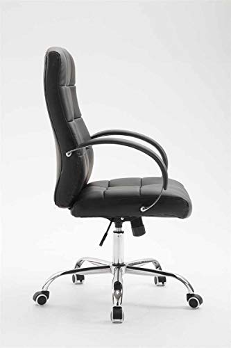 La poltrona da direttore non è solo comoda, ma anche robusta, avendo infatti una capacità di carico di ben 120 kg. La sedia da scrivania si compone di un alto e comodo schienale e di pratici braccioli, piacevolmente imbottiti. L'intera seduta, foderata in similpelle di ottima qualità, 100% poliuretano, poggia su una base solida e stabile, realizzata in metallo cromato. La base a croce è composta da 5 ruote a basso attrito
