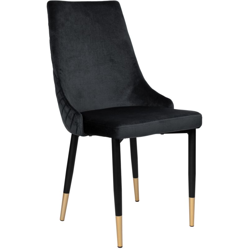 VERMONT sedia glamour in velluto nero Destinazione d'uso: soggiorno, sala da pranzo | Colori: nero, oro La sedia Vermont è caratterizzata da un bellissimo rivestimento in velluto e da una robusta struttura in metallo. La sua base, grezza nella forma, è realizzata in metallo e verniciata a polvere nei colori più alla moda: nero e oro. Lo schienale è cucito in modo tale che l'interessante motivo geometrico rifrange in modo intrigante la luce e attira lo sguardo. La seduta stessa ha uno spessore di 6 cm, che garantisce un vero comfort durante il relax. Consigliamo le sedie Vermont soprattutto agli amanti dello stile glamour, ricco di accessori lucenti. Caratteristiche del prodotto ✅Comfort: il materiale del rivestimento, il velluto, offre comfort e morbidezza, aumentando il comfort di utilizzo. ✅Durabilità e stabilità: La struttura in metallo garantisce la solidità della struttura e la lunga durata del mobile. ✅ Estetica: le gambe nere e dorate aggiungono eleganza e un carattere moderno
