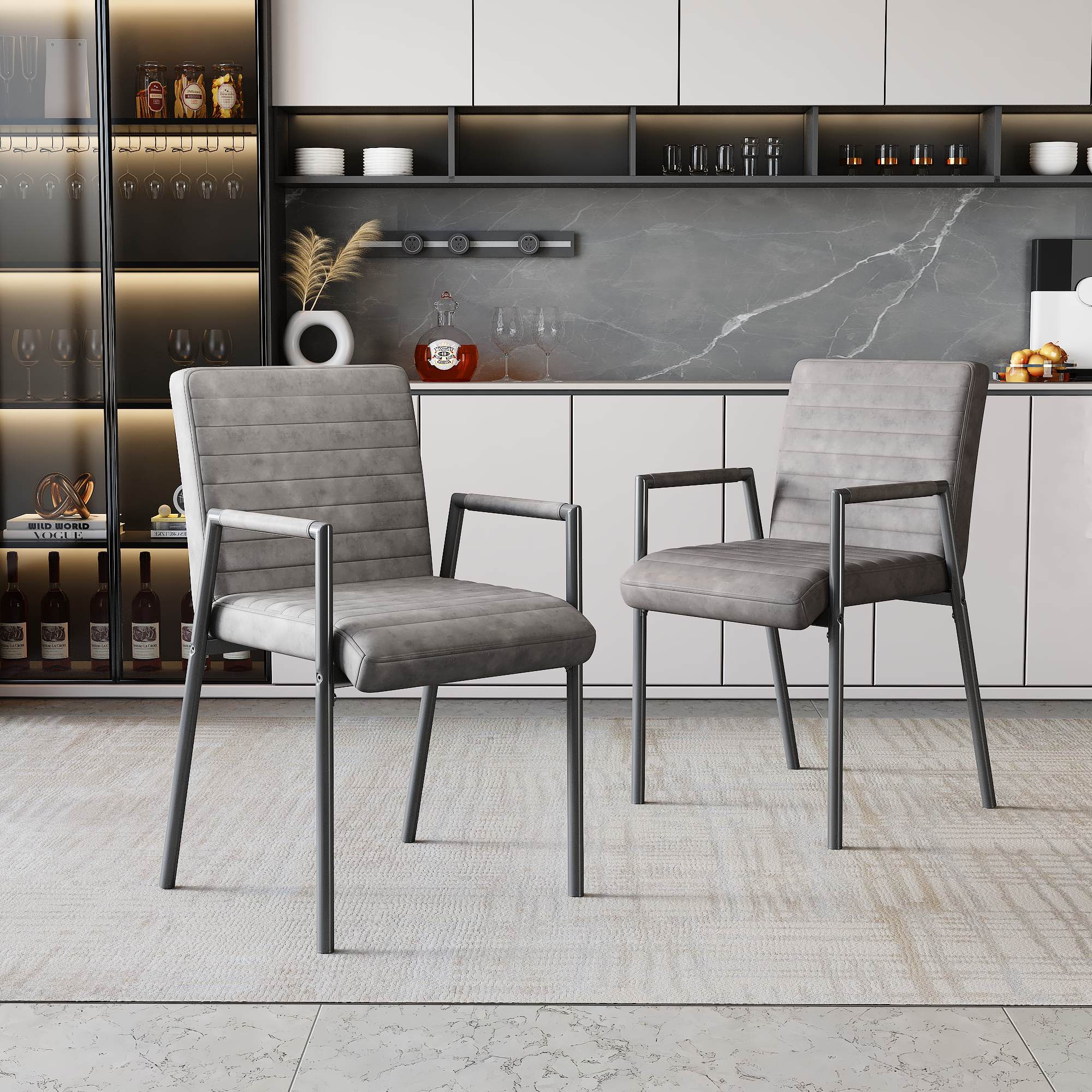 Set di 2 sedie da pranzo a Righe Verticali, con Seduta Imbottita e Gambe in Metallo, Poltrona Moderna per Salotto e Camera da Letto, Colore Grigio. Queste sedie eleganti combinano funzionalità e stile moderno, ideali per aggiungere un tocco di classe a qualsiasi ambiente. La struttura in metallo robusto garantisce stabilità e durata, supportando un peso fino a 150 kg. Il design ergonomico con braccioli confortevoli offre un sostegno ottimale, rendendo queste sedie perfette per trascorrere lunghe ore seduti, sia che si tratti di una cena che di un uso in ufficio o in altri spazi.