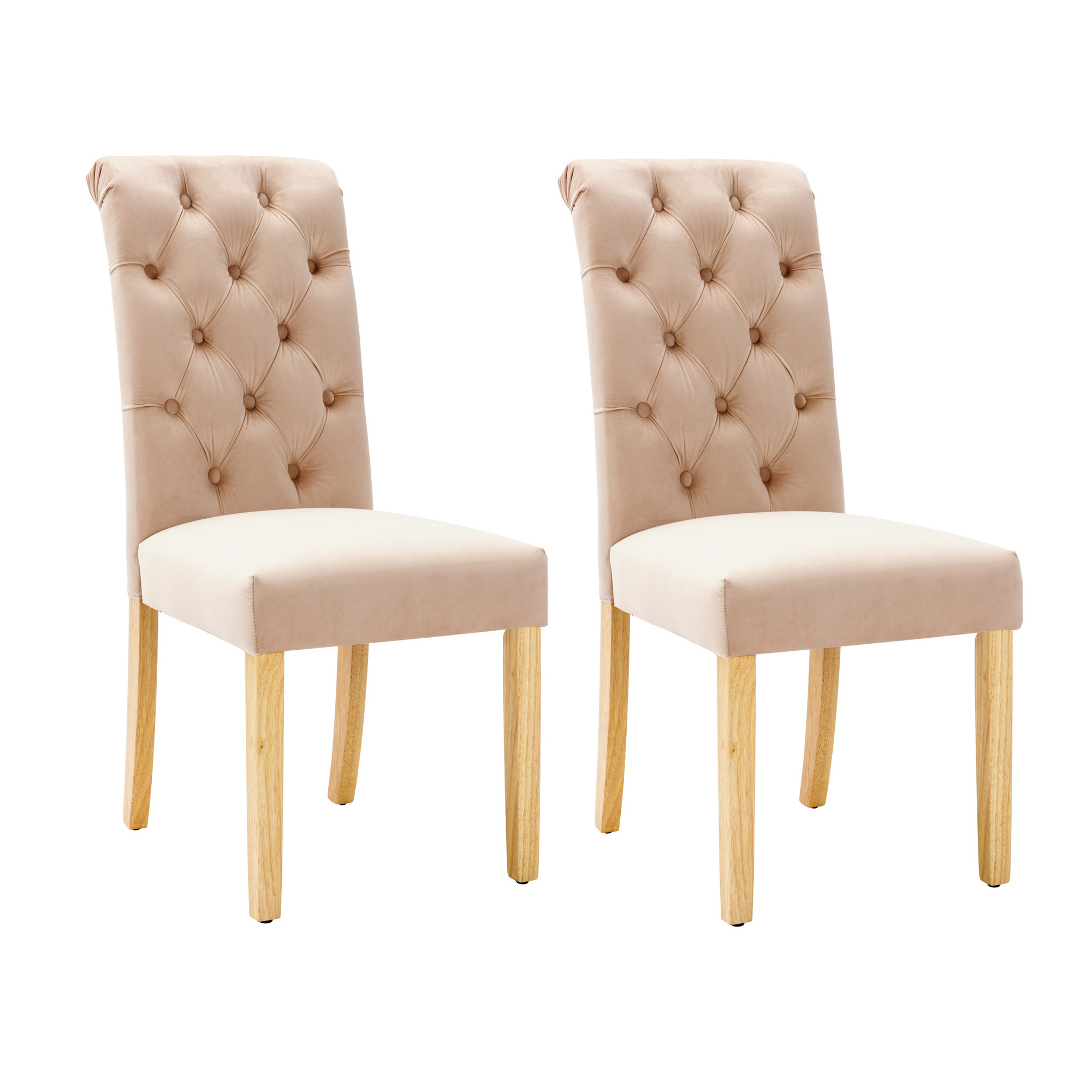 Scopri il comfort e l'eleganza del nostro set di 2 sedie da pranzo in tessuto effetto velluto con gambe in rovere, perfette per aggiungere un tocco di classe a qualsiasi sala da pranzo. Queste sedie presentano un rivestimento in tessuto effetto velluto di alta qualità che offre una sensazione di eleganza e comfort, ideali per lunghe serate a tavola o semplici momenti di relax. Le dimensioni di ciascuna sedia sono 43x65x101 cm e, grazie a un'altezza della seduta di 47 cm, si garantisce una seduta ergonomica e confortevole. Ogni sedia supporta fino a 150 kg grazie alla solida costruzione in legno massello e metallo, con dettagli raffinati come i bottoni decorativi e il manico cromato sul retro che aggiungono un tocco di eleganza.