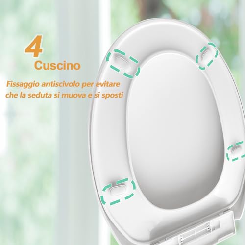 【Funzione Di Smontaggio Rapido】Il coperchio della toilette è dotato di un pulsante: in caso di necessità,è sufficiente premere il pulsante per rimuovere il coperchio dalla toilette, pulirlo e rimontarlo facilmente.Sul fondo del coperchio della toilette sono inoltre presenti 4 paracolpi che lo fissano efficacemente e ne impediscono lo spostamento.