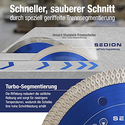 SEDION ® Disco da taglio diamantato 115 mm - Disco da taglio per il taglio di piastrelle dure in ceramica porcellana gres granito marmo - Disco diamantato 115mm x 22,23 - Sedion Premium Quality