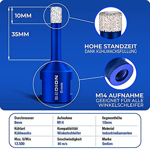 SEDION ® Punta per piastrelle 8 mm x M14 - Punta per forare piastrelle dure - Punta diamantata da 8 mm - diamanti di alta qualità Sedion - compatibile con Bosch Makita e molti altri.