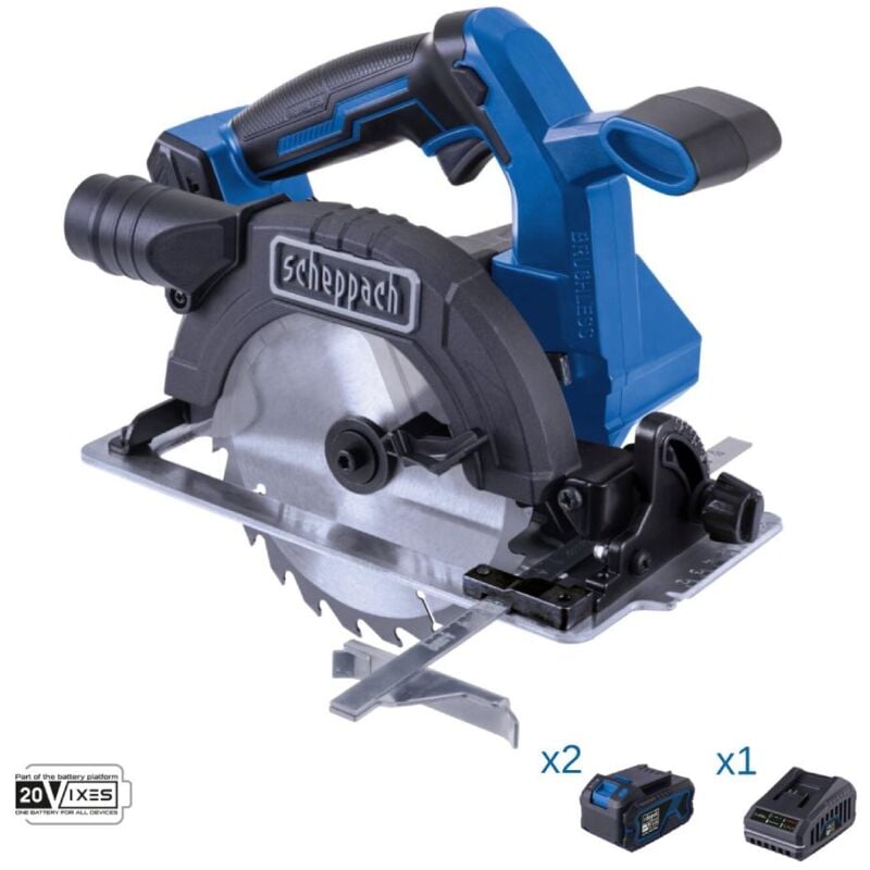 Il kit comprende: 1 Sega circolare brushless disco 165 mm Scheppach bc-hcs165-x serie 20v ixes 2 Batterie al litio 20V 4.0Ah Scheppach SBP4.0 serie 20V ixes 1 Caricabatteria 20V 2.4A SBC2.4 serie 20V ixes Sega circolare brushless disco 165 mm Scheppach bc-hcs165-x serie 20v ixes La Scheppach BC-HCS165-X è una sega circolare portatile a batteria potente e compatta per un taglio preciso del legno. Grazie alle possibilità di regolazione continua della profondità e dell'angolo di taglio e alla facile sostituzione della lama tramite il blocco del mandrino (SPINDLE LOCK), la sega circolare manuale è facile da usare. Il BC-HCS165-X è alimentato da un potente motore brushless. Questo motore senza spazzole garantisce un'efficienza particolarmente elevata, una maggiore autonomia, una lunga durata e una minore usura. Come parte della serie Scheppach IXES da 20 volt, tutte le batterie e i caricabatterie della serie possono essere combinati con la sega circolare manuale. Batteria e caricabatterie