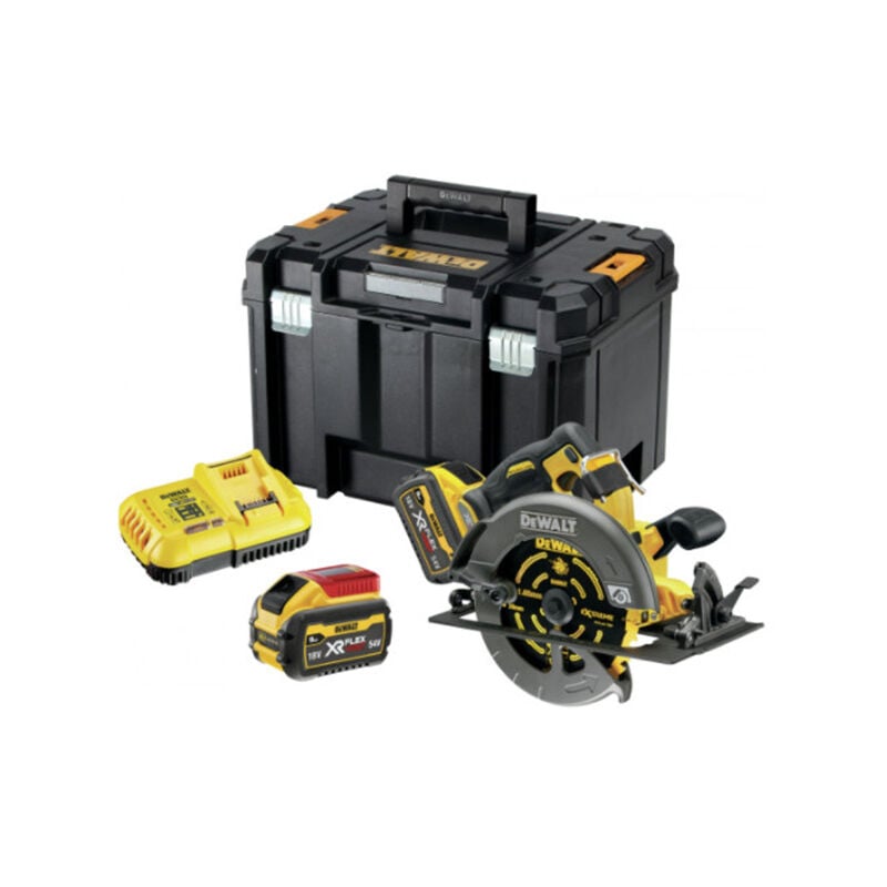 Dettagli: DEWALT XR FLEXVOLT 54V, la potenza del cablato Motore senza carboncini, più potenza, più tempo di lavoro e maggiore durata Sega circolare per rifilatura / troncatura / tagli obliqui di legno o altri materiali da costruzione Inclinazione lama 57° Graduazione per regolare con precisione la profondità di taglio fino a 67 mm Macchina ben bilanciata Elevata qualità di progettazione per un funzionamento con basse vibrazioni e lunga durata Impugnatura aggiuntiva per una presa a due mani della macchina con maggiore sicurezza Compatibile con gli aspirapolvere DEWALT grazie al sistema Airlock Soffiatore per liberare la linea di taglio da polvere e detriti Lampada LED per una migliore visibilità Dotazione: Fornito con 2 batterie, caricabatterie, lama in carburo 24 denti, guida parallela e valigetta TSTAK Caratteristiche: Regime a vuoto 0-5800 giri/min Ø lama / alesaggio: 190 / 30 mm Inclinazione taglio obliquo 57° Profondità di taglio a 90° 67 mm Profondità di taglio a 45° 49 mm