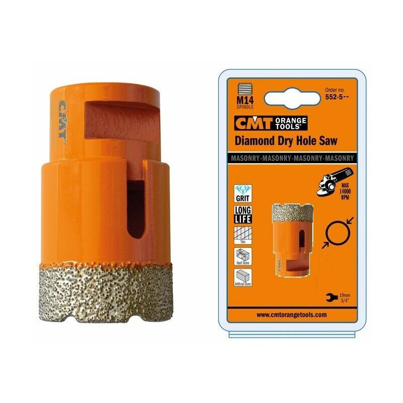 SEGA A TAZZA DIAMANTATA 35 mm CMT ART. 552-535 Sega a tazza diamantata, per taglio a secco. Attacco per smerigliatrice M14. Grazie all'adattatore, CHE PUO' ESSERE ACQUISTATO SEPARATAMENTE, può essere utilizzata anche con il trapano. Prodotto adatto per USO PROFESSIONALE. SUGGERIMENTO DI UTILIZZO Iniziate la foratura (con l utensile già in rotazione) con un angolo di circa 30° tra la sega a tazza e il piano, in questo modo eviterete lo slittamento dell utensile e otterrete un centraggio più preciso (in questa fase appoggiate la macchina al piano, in modo d avere più stabilità). Continuate la foratura verticalmente ma accompagnando l utensile con un movimento orbitale che favorisca il raffreddamento e l evacuazione del materiale lavorato (se utilizzate la guida iniziate la foratura verticalmente, poi toglietela e continuate in maniera orbitale). Ricordate che non si tratta di una punta, ma di una fresa, quindi una foratura perfettamente perpendicolare ridurrà notevolmente la vita dell