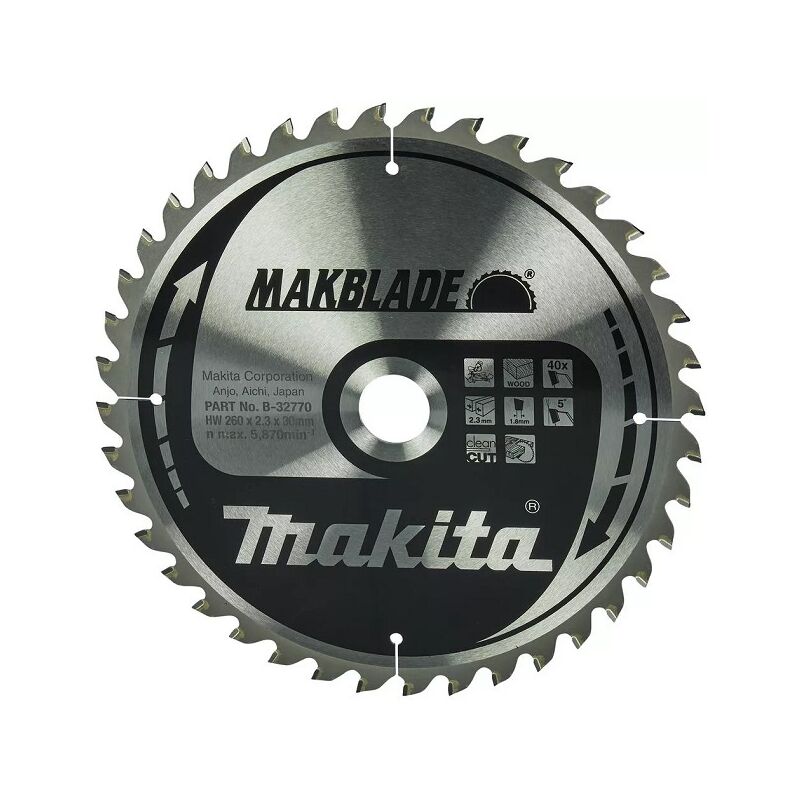 Dati tecnici: Dati tecnici: Tipo disco: Makblade Diametro disco: 260 mm Diametro foro disco: 30 mm Spessore lama: 2,3 mm Spessore disco: 1,8 mm Numero di denti: 40 Angolo dei denti: 5 ° Taglio trasversale: •Max. Velocità: 5990 giri/min Applicazione: Legno I dischi completamente temprati e tensionati assorbono le vibrazioni e rimangono piatti e indeformati Carburo di tungsteno di alta qualità con basso coefficiente di abrasione. Il taglio sottile garantisce meno scarti e riduce la forza di avanzamento necessaria**