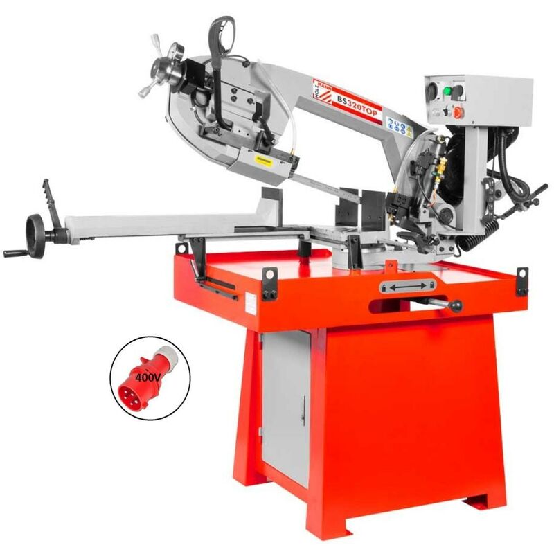 SEGA A NASTRO METALLO CON DISCESA MANUALE IDRAULICA BS320TOP_400V HOLZMANN Potente trasmissione a 2 stadi con design ad ingranaggi Regolazione dell'angolo di taglio: L: 0-45°, R: 0-60 Abbassamento braccio sega selezionabile automatico o manuale Dopo aver completato il taglio la sega verrà spenta automaticamente a finecorsa Morsa robusta (altezza superficie da terra = 950 mm) Cilindro idraulico per velocità di abbassamento regolabile in continuo Interruttore per selezione delle 2 velocità del nastro della sega (35 m/min;