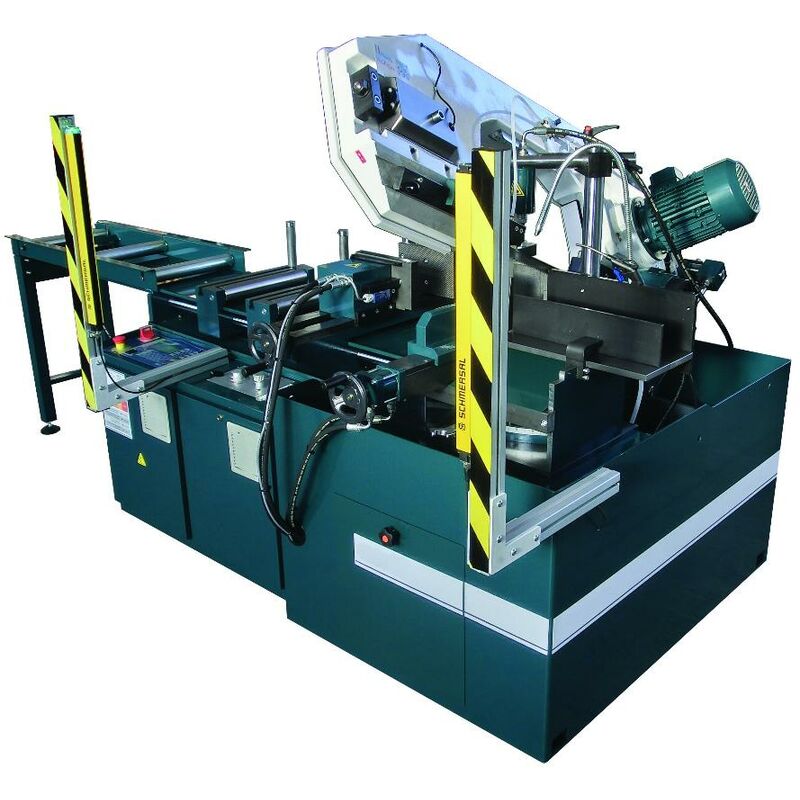Dettagli: Ciclo automatico o semiautomatico completamente idraulico per nastro, arco e morsa Arco in alluminio fuso ad altissima rigidità Sistema di lubrificazione a 3 punti con elettropompa Fondo morsa rimovibile Microinterruttore per la tensione del nastro con rilevamento della rotazione Tensione del nastro regolabile con dispositivo di arresto automatico in caso di rottura o scivolamento del nastro Guide nastro regolabili con inserti e cuscinetti in carburo Facile rotazione dell'archetto su cuscinetti fino a 60° a sinistra Dispositivo di regolazione della pressione di avanzamento e di taglio Comandi a bassissima tensione a 24 V Protezione del motore tramite interruttore termico Isolamento elettrico IP 54 Sezionatore lucchettabile Arresto a fungo con fermo Alloggiamento del nastro dotato di microinterruttore positivo Morse idrauliche Variatore elettronico di velocità Arresto digitale da 600 mm Dispositivo di arresto macchina a fine barra: pezzo finale 110 mm Doppio dispositivo
