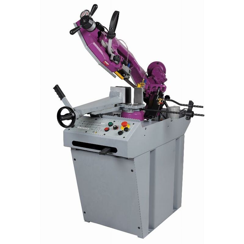 Dettagli: Arco in ghisa Guide del nastro con cuscinetti e inserti in carburo per un'eccellente resistenza all'usura del nastro Guida anteriore a nastro mobile regolabile Discesa autonoma per gravità controllata da cilindro idraulico Sistema di lubrificazione a 2 punti con elettropompa Microinterruttore e indicatore di tensione del nastro Morsa a serraggio rapido montata su slitta con compensazione del gioco Controllo variabile della velocità del nastro Pannello di controllo frontale Comandi a bassissima tensione 24 V Arresto a fungo con gancio Alloggiamento del nastro dotato di microinterruttore positivo Protezione del motore tramite interruttore termico Motore con riduttore coassiale