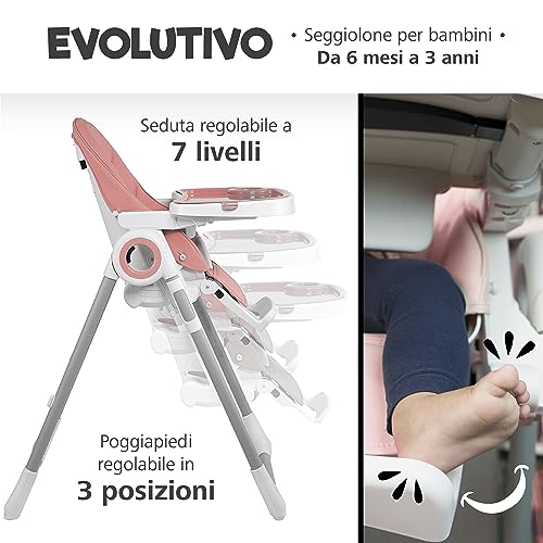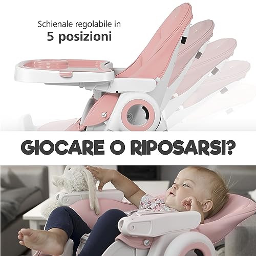 Seggiolone Pappa Regolabile e Pieghevole - 7 Livelli Diverse, Schienale Bambino Pieghevole 5 Posizioni, Ripiano Smontabile, Vassoio a Clip (Facile da Pulire) - Rosa