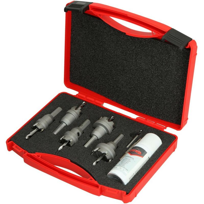 La pratica scatola di plastica comprende seghe a campana piatte, utilizzabili in mano e trapani a colonna. Le seghe campanarie sono adatte per leghe in acciaio con alto contenuto di cromo, come v2a e v4a (fino a 2.0 mm), acciaio e ghisa, metalli non ferrosi e leggeri, plastiche, tessuti armati, piastre in gesso e pannelli leggeri, così come la lavorazione del legno fino a max. 4.0 mm con fori a colonna, utilizzare solo anticipo manuale.