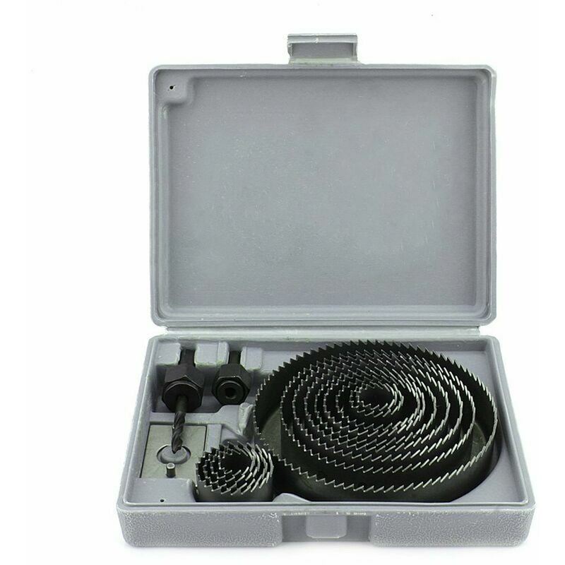 12 seghe a tazza in acciaio al carbonio Adatto per fori precisi in legno, plastica, fibra di vetro, truciolare, cartongesso, artigianato, non richiede manutenzione Tutte le parti in una pratica valigia Dimensioni: 19, 22, 29, 32, 38, 44, 51, 64, 76, 89, 102, 127 mm < /ul>