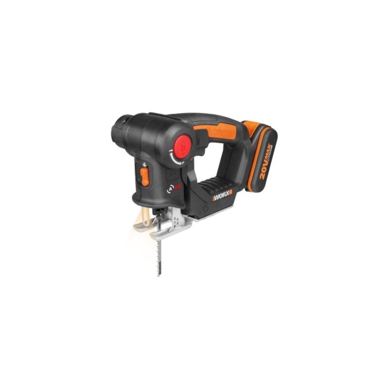 SEGHETTO A BATTERIA WORX AXIS A GATTUCCIO/ALTERNATIVO WX550 CON BATTERIA 20V E CARICABATTERIE INCLUSI -seghetto alternativo è ideale per il taglio del legno, metalli ed altri componenti in plastica. Viene impugnato nella parte superiore mentre la lama lavora nella parte sotto - Il seghetto a gattuccio è dotato di una lama flessibile che consente di tagliare diversi tipi di materiale (legno, acciaio, ferro...). Il taglio qui è molto più preciso poiché questi vengono svolti frontalmente, permettendo all'operatore di visionare il lavoro che sta compiendo - monta una batteria 20V DC da 2,0 Ah Li-Ion che garantisce prestazioni ottimali senza richiedere troppa manutenzione. Inoltre, non possiede effetto memoria: può essere ricaricata anche se è scarica solo parzialmente, senza creare danni - Il seghetto Axis viene fornito con 4 lame intercambiabili in tutta semplicità: 1 per il taglio del legno, 1 per il taglio dell'acciaio, 1 per la potatura ed 1 per il taglio di PVC/plastica. La testina