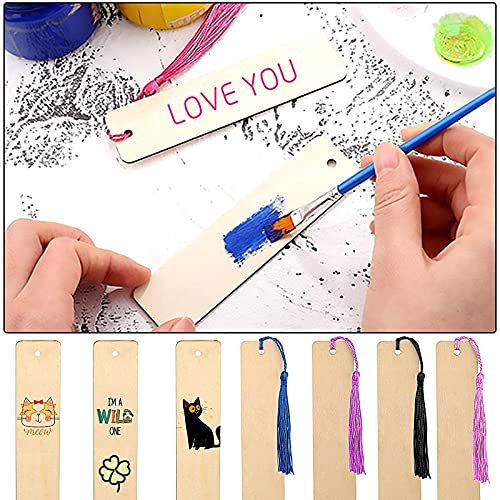 Set di 70 segnalibri in legno vuoto, 35 pezzi fai da te spesso segnalibri in legno + 35 nappe in 5 colori, etichette rettangolari da appendere, con fori, compleanni, feste di Natale (12 x 3 cm)