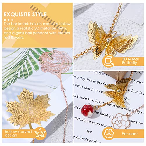 2 Set di Segnalibro Foglia di Metallo, Segnalibri Ciondolo Classici con Ciondolo Farfalla 3D e Perle di Vetro Ciondolo Fiore Secco Eterno per Lettore Insegnanti Donne Bambini, Lettori (Oro + Oro Rosa)