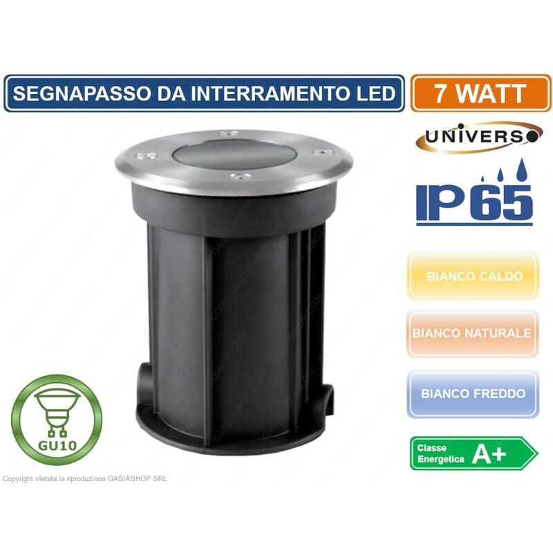 Portalampada da interramento con lampada GU10 da 7W inclusa. Ideale per illuminazione a terra di piante e cortili. Molto robusto grazie alla corona superiore in acciaio inox e alluminio e copertura in vetro temperato . Perfetto per essere posizionato anche nelle zone calpestabili. Completo di cassero in materiale plastico nero e portalampada per un faretto GU10 (non incluso), che potete trovare nel nostro negozio. Grazie al grado di protezione IP65, questo portalampada è adatto ad essere installato anche all'aperto. Facile da montare, può essere connesso all'impianto grazie ai cavi a saldare . Nella confezione riceverete anche una chiave a brugola per rimuovere le viti della corona e accedere al portalampada. Questo modello di segnapasso disponibile con 3 diverse temperature colore: Luce Bianca Calda, Bianca Naturale e Bianca Fredda .