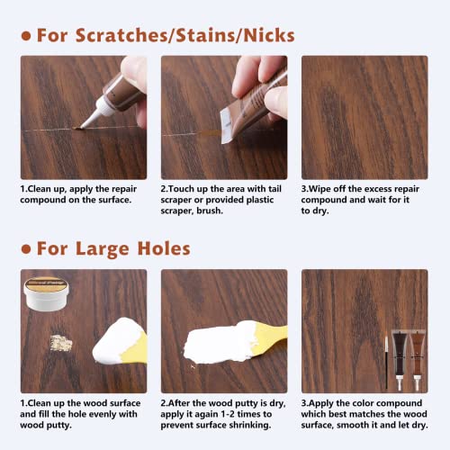 【Kit di riparazione per graffi/fori del legno perfetto】 Ripristina tutti i tipi di danni come graffi superficiali, scheggiature, crepe, fori, intaccature, graffi e scolorimento su pavimenti in legno e mobili come armadi, guardaroba, scrivanie, porte, tavoli, telai dei letti, artigianato in legno e così via.